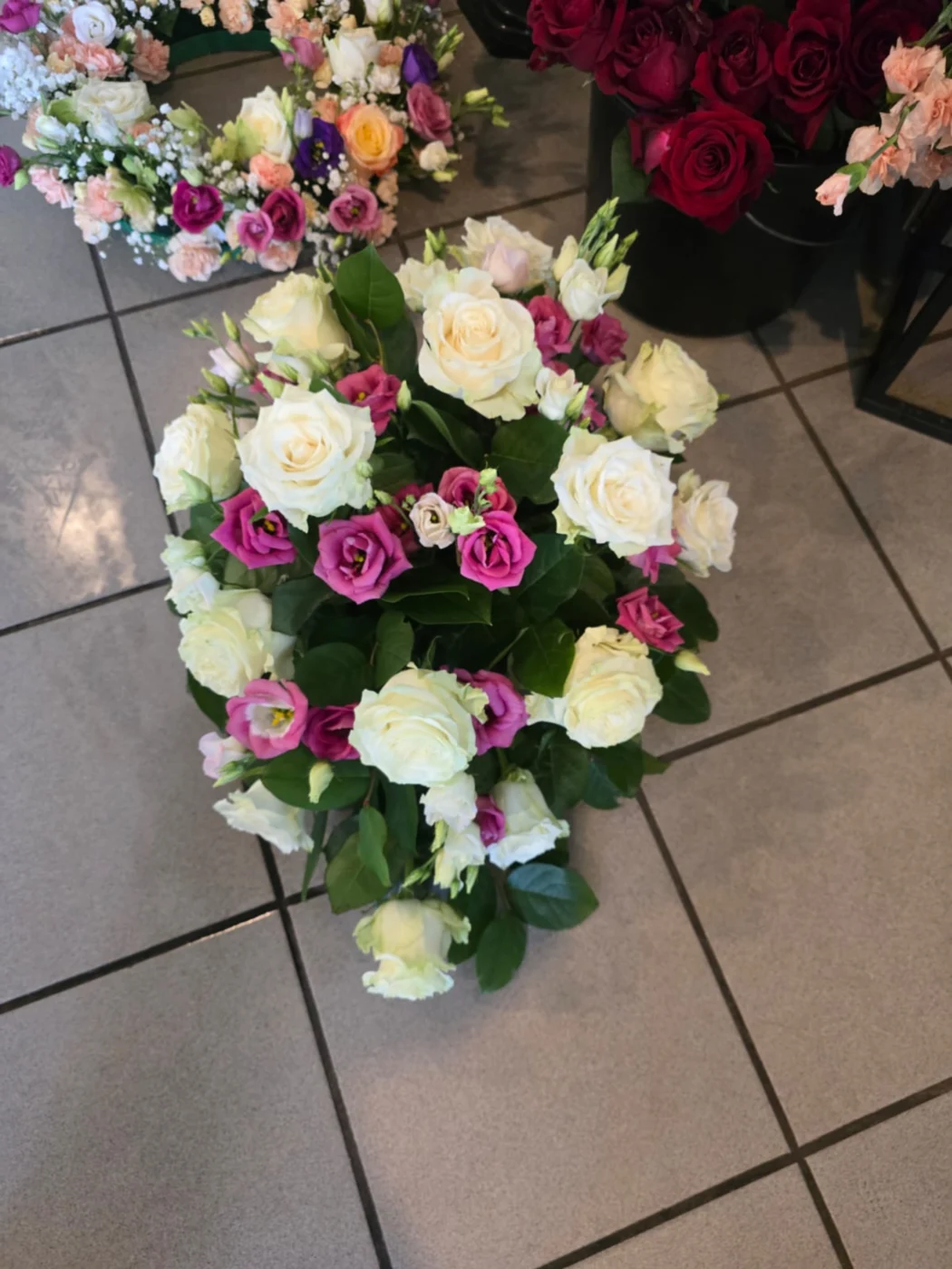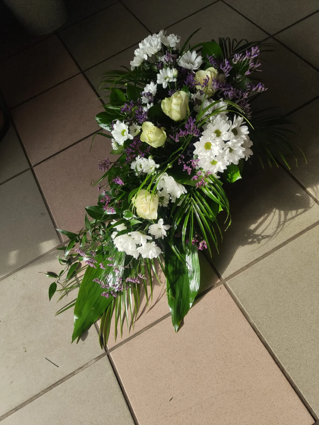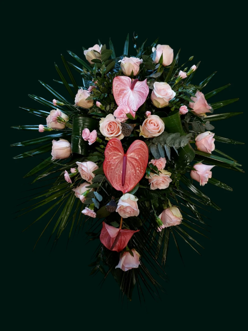 Bardzo elegancka kompozycja, która jest układana “na płasko” lub lekko wypukło. Nie używa się większego stelaża, a rozmiary wiązanki są znacznie mniejsze niż wieńca. Kwiaty układane są w kształcie wachlarza lub łuku. Przeważnie jest jedną z bardziej popularnych wyborów pogrzebowych z uwagi na łatwość w transporcie.